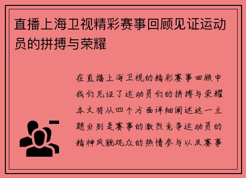 直播上海卫视精彩赛事回顾见证运动员的拼搏与荣耀