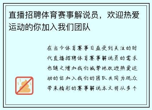 直播招聘体育赛事解说员,欢迎热爱运动的你加入我们团队